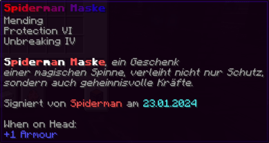 Diese Maske, inspiriert von der Finesse einer magischen Spinne, schützt den Träger nicht nur vor Schaden, sondern schärft auch seine Sinne, um wie ein Wächter der Nacht über die Stadt zu wachen.