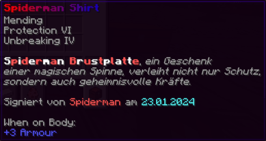 - mit einem Rechtsklick können Spinnenweben platziert werden (vorausgesetzt man besitzt die vollständige Rüstung)