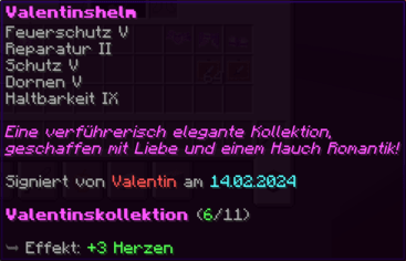 Ein Helm, der mit "Feuerschutz IV" und "Reparatur II" gegen alle Unbill schützt. "Dornen V" lässt keine Sorgen nahekommen, und "Haltbarkeit IX" wird die Zeiten überdauern, wie die Erinnerungen an einen ersten Kuss.