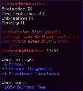 Mit Schutz IX, Feuerschutz VII, Haltbarkeit IX und Reparatur II geschmiedet, ist dieser Harnisch der Kern der Dunkelheit. In blutrotem Stahl gehüllt, verneigt sich die Nacht selbst vor seinem Träger, dem Auserwählten der Schatten.