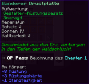 Eine mächtige Brustplatte, geschmiedet für die unerbittlichsten Schlachten. Sie schützt vor schwersten Explosionen (Explosionsschutz IV), heilt sich selbst (Reparatur), stößt Angreifer ab (Dornen III), und ihre Haltbarkeit kennt keine Grenzen (Haltbarkeit X). Eine Brustplatte, würdig der Erzählungen eines Helden.