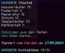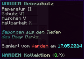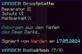 Die WARDEN Brustplatte bietet ultimativen Schutz. Mit Reparatur II und Schutz VI bleibt sie immer in bestem Zustand. Haltbarkeit X macht sie extrem langlebig. Geborgen aus den Tiefen des Deep Darks und signiert vom Warden selbst, ist diese Brustplatte ein unverzichtbarer Teil deiner Rüstung.