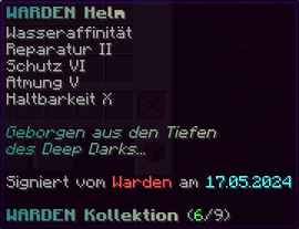 Der WARDEN Helm ist ein unverzichtbarer Schutz für jeden Abenteurer. Mit Wasseraffinität kannst du unter Wasser atmen, während Reparatur II und Schutz VI für maximale Sicherheit sorgen. Atmung V und Haltbarkeit X machen diesen Helm extrem langlebig. Geborgen aus den Tiefen des Deep Darks und signiert vom Warden selbst.