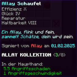 Eine Schaufel, so flink und geschickt wie ein Allay. Mit den Verzauberungen Effizienz X, Glück IV, Reparatur und Haltbarkeit VIII ermöglicht sie schnelles und effizientes Graben. Perfekt für Schatzsucher und Bauherren, die den Boden nach wertvollen Ressourcen durchforsten.