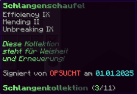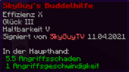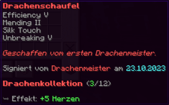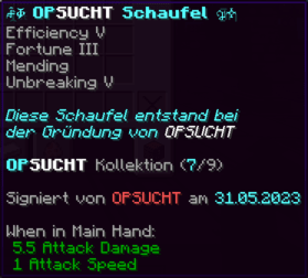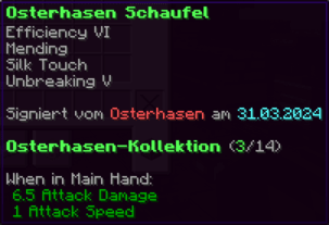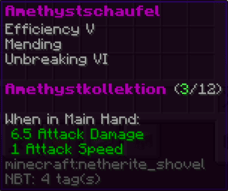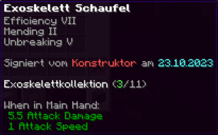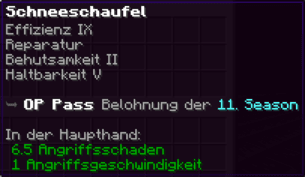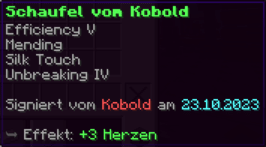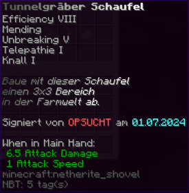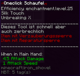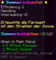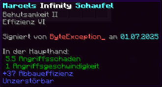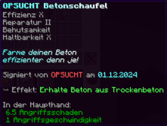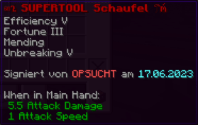 Eine Schaufel, optimiert für extreme Effizienz und höchste Präzision. Sie ist mit Effizienz X, Reparatur II, Behutsamkeit und Haltbarkeit X verzaubert, wodurch sie Beton in Rekordzeit abbaut und dabei nahezu unzerstörbar bleibt.