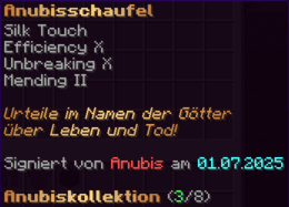 Diese göttliche Schaufel wurde mit Behutsamkeit eines uralten Priesters versehen, verstärkt durch Effizienz X und eine nahezu unzerbrechliche Struktur dank Haltbarkeit X. Ihre Kraft erneuert sich mit Reparatur II fast wie von selbst. Sie richtet über Leben und Tod im Namen der Götter.