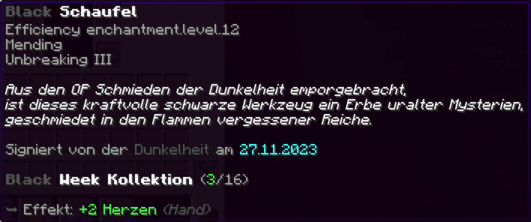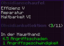 Eine elegante Schaufel aus unzerbrechlichem Obsidian, die selbst die härtesten Materialien mühelos durchdringt. Verzaubert mit Effizienz V, Reparatur und Haltbarkeit V – ein unverzichtbares Werkzeug für jeden Abenteurer.