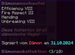 Eine Schaufel, die durch dämonische Energie verstärkt wurde, um jeden Widerstand zu brechen. Sie ist verzaubert mit Effizienz VIII, Verbrennung III, Reparatur und Haltbarkeit VIII.