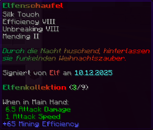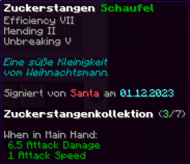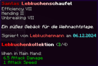 Eine verzauberte Schaufel, die mit der Süße der Feiertage gefüllt ist. Mit Effizienz VII, Reparatur II und Haltbarkeit VII ausgestattet, ermöglicht sie schnelle und mühelose Grabungen.