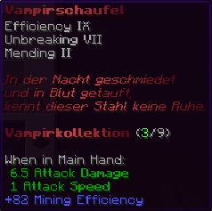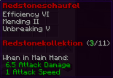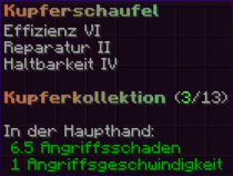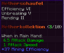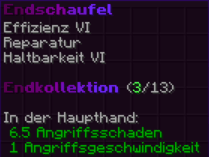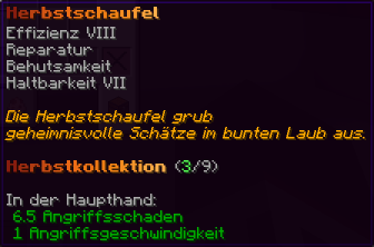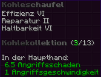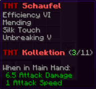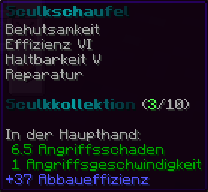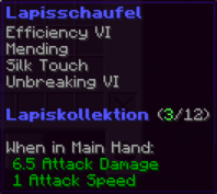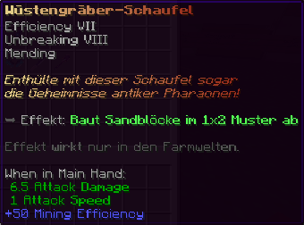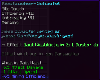 Eine Schaufel, die mit "Effizienz VI" glänzt, ermöglicht es dem Träger, durch jedes Material wie durch Butter zu schneiden. "Behutsamkeit" behält die Schönheit der Blöcke bei, während "Unzerstörbarkeit VI" sie fast unzerstörbar macht.
