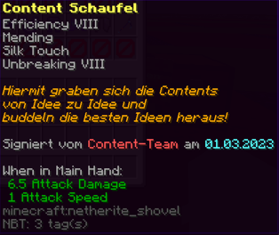 Die Content Schaufel ist ein mächtiges Werkzeug, das jedem kreativen Abenteurer würdig ist! Mit unglaublicher Geschwindigkeit (Effizienz VIII) gräbt sie sich durch Berge von Ideen, um die besten zu Tage zu fördern. Ihre zarte Berührung (Behutsamkeit) bewahrt jede Idee in ihrer reinsten Form, während sie sich durch magische Kräfte immer wieder selbst heilt (Reparatur) und nahezu unzerstörbar ist (Haltbarkeit VIII).
