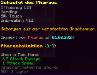Eine geheimnisvolle Schaufel, die mit Effizienz VII, Haltbarkeit VIII und Reparatur verzaubert ist. Sie soll die Geheimnisse uralter Pharaonen beim Ausgraben antiker Grabstätten enthüllen und zeigt ihre wahre Stärke in den Sandwüsten der Farmwelt.