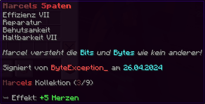 Marcels Spaten ist perfekt für jeden Gärtner und Abenteurer. Mit Effizienz VII gräbt er schnell, während Reparatur und Haltbarkeit VII ihn unzerstörbar machen. Behutsamkeit sorgt dafür, dass alles unversehrt bleibt. Marcel versteht die Bits und Bytes wie kein anderer!