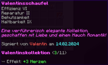 Eine Schaufel so zart wie eine Liebesgabe, die mit "Effizienz VII" und "Behutsamkeit" ausgestattet ist, um sorgsam Schätze zu heben. "Reparatur II" und "Haltbarkeit IX" sorgen dafür, dass sie niemals versagt. Sie ist ein Werkzeug der Valentinskollektion, das die Arbeit zu einer Liebesaffäre macht.