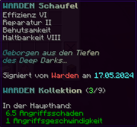 Die WARDEN Schaufel ist perfekt für jeden Gärtner und Abenteurer. Mit Effizienz VI gräbt sie schnell, während Reparatur II und Haltbarkeit VIII sie unzerstörbar machen. Behutsamkeit sorgt dafür, dass alles unversehrt bleibt. Diese Schaufel wurde aus den Tiefen des Deep Darks geborgen und wurde vom Warden selbst signiert!