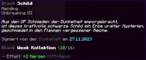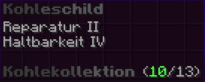 Ein unerschütterliches Schild, gefertigt aus der stärksten Kohle, um seinen Träger vor jeglichen Angriffen zu schützen. Verzaubert mit Reparatur II und Haltbarkeit IV, bietet es außergewöhnliche Langlebigkeit und die Fähigkeit, stets einsatzbereit zu bleiben – ein wahrer Verteidigungspartner in jeder Schlacht.