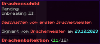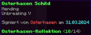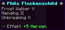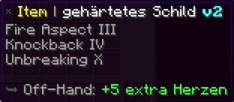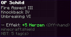 Das OP Schild ist ein mächtiger Schutz, geschmiedet für wahre Helden. Mit seiner feurigen Kraft (Feueraspekt III) brennt es jeden Feind, der sich wagt, zu nah zu kommen, und wirft Angreifer mit einem gewaltigen Stoß (Rückstoß IV) weit zurück. Unzerstörbar (Haltbarkeit VI) bietet es dauerhaften Schutz in den gefährlichsten Kämpfen.