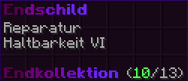 Ein Schild, gehärtet durch die Energien des Endes, bietet unerschütterlichen Schutz. Mit Reparatur und Haltbarkeit VI verzaubert, trotzt es selbst den stärksten Angriffen.