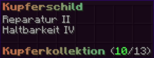 Ein verlässlicher Schild, geschmiedet aus widerstandsfähigem Kupfer, um maximalen Schutz zu bieten. Verzaubert mit Reparatur II und Haltbarkeit IV, hält er auch den härtesten Angriffen stand und ist stets einsatzbereit.
