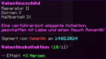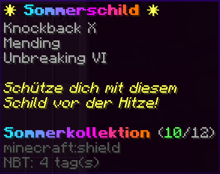 Das Sommerschild ist ein leuchtender Schutz, erfüllt mit der Kraft der Sonne. Es wirft deine Gegner mit unglaublicher Wucht zurück (Rückstoß X) und heilt sich durch die magische Energie des Tagessterns (Reparatur). Mit seiner fast unzerstörbaren Struktur (Haltbarkeit VI) ist es der perfekte Schutz vor allen Gefahren, die dich in deinen Abenteuern erwarten.