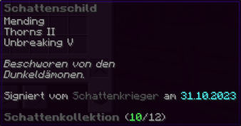 Dieser Schild, gerufen aus den Tiefen der Dunkelheit, ist ein Bollwerk gegen die verborgenen Gefahren der Nacht. Signiert von einem Schattenkrieger, ist er ein Stück der Schatten selbst.