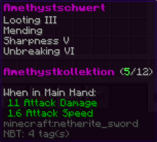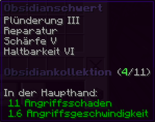 Das Obsidianschwert ist eine mächtige Waffe aus der Obsidiankollektion. Mit Plünderung III erhältst du wertvolle Beute, Reparatur hält das Schwert in Topform, und Schärfe V macht es extrem scharf. Haltbarkeit VI sorgt dafür, dass es lange hält. Dieses Schwert verleiht dir 11 Angriffsschaden und 1.6 Angriffsgeschwindigkeit.