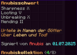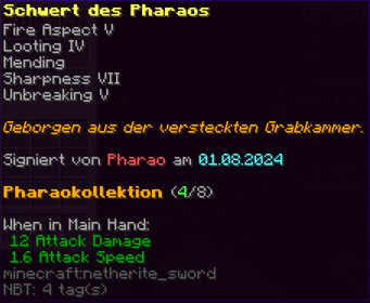 Das Schwert des Pharaos ist ein sagenumwobenes Artefakt, tief in den versteckten Grabkammern der alten Könige verborgen. Seine Klinge lodert mit der Hitze der Wüste (Feueraspekt V) und entfesselt mächtige Feuerstürme gegen seine Feinde. Mit unglaublicher Schärfe (Schärfe VII) zerschneidet es jeden Gegner, während es mit jedem Sieg wertvolle Schätze sammelt (Plünderung IV). Durch seine magische Energie heilt es sich von selbst (Reparatur) und ist nahezu unzerstörbar (Haltbarkeit V).