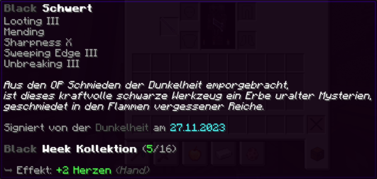 Ein Klinge aus der Dunkelheit selbst, versehen mit Schärfe IX, Haltbarkeit VII und Reparatur II. In der Nacht geschmiedet und in Blut getauft, fließt durch sie die unstillbare Gier nach Leben. Jeder Hieb nährt den Träger und vergießt das Blut der Feinde.
