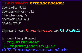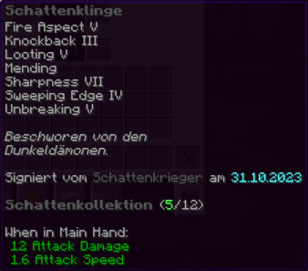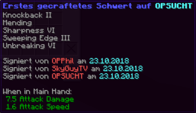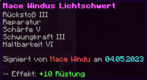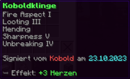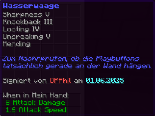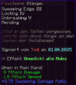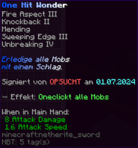 Das One Hit Wonder ist ein legendäres Schwert, das für wahre Helden geschmiedet wurde. Mit seiner feurigen Klinge (Feueraspekt III) entzündet es seine Feinde, und durch die enorme Schlagkraft (Rückstoß II) schleudert es Gegner weit zurück. Seine präzisen, weiten Schläge (Schwungkraft III) treffen ganze Gruppen von Mobs, während es sich magisch selbst heilt (Reparatur) und durch seine unzerstörbare Stärke (Haltbarkeit IV) immer einsatzbereit bleibt.