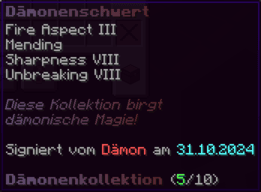 Ein dämonisches Schwert, geschmiedet in den Tiefen der Hölle. Es ist mit Verbrennung III, Reparatur, Schärfe VIII und Haltbarkeit VIII verzaubert, wodurch es furchteinflößend stark ist.