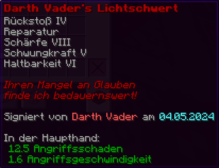 Darth Vaders Lichtschwert ist eine mächtige Waffe, die jeden Gegner beeindruckt. Mit Rückstoß IV stößt es Feinde zurück, und dank Reparatur bleibt es immer in bester Form. Schärfe VIII und Schwungkraft V machen es extrem gefährlich, und Haltbarkeit VI sorgt dafür, dass es niemals kaputt geht. "Ihren Mangel an Glauben finde ich bedauerlich," sagt Darth Vader selbst!