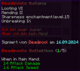 Eine Klinge, so scharf wie der Humor ihres Besitzers. Mit Plünderung VI, Reparatur II, Schärfe XV und Haltbarkeit IX verzaubert, ist sie eine tödliche Waffe, die Chaos und Zerstörung hinterlässt. Perfekt für einen unsterblichen Söldner mit Stil.