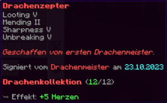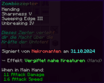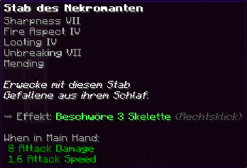 Ein mystisches Zepter, das die Macht über die Untoten verleiht. Es ist verzaubert mit Schärfe V, Schwungkraft III und Haltbarkeit IV, wodurch es zu einer unaufhaltsamen Waffe wird.