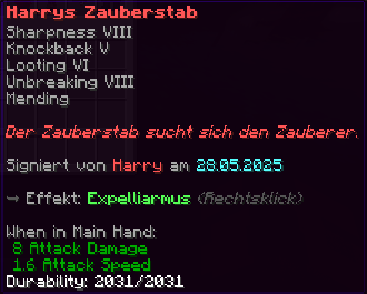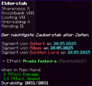 Der mächtigste Zauberstab aller Zeiten – geschliffen durch Blutlinien, geführt von Legenden. Mit den Verzauberungen Schärfe X, Rückstoß VIII, Plünderung VII, Haltbarkeit X und Reparatur II ist er nicht nur eine Waffe, sondern ein Katalysator purer Magie. Wer ihn trägt, führt mehr als Macht – er trägt das Gleichgewicht der Zauberwelt in seiner Hand.