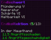 Mit Schärfe VI teilst du erheblichen Schaden aus. Plünderung V maximiert deine Beute, während Haltbarkeit V und Reparatur das Schwert langlebig halten.