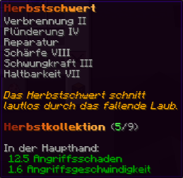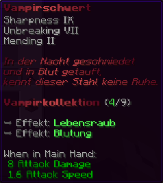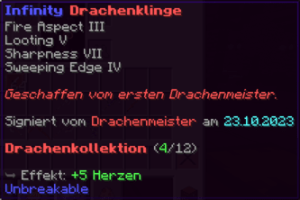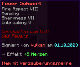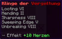 Ein Schwert für wahre Helden, das mit dem Feuer der Drachen geschmiedet wurde (Verbrennung), Gegner sanft zurückstößt (Rückstoß), extra Beute bringt (Plünderung) und nie seine Schärfe verliert (Schärfe und Haltbarkeit). Dieses Schwert gibt seinem Träger die Kraft von zehn Herzen und macht ihn unüberwindbar.