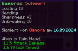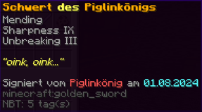 Das Schwert des Piglinkönigs ist ein goldenes Relikt, das von den stolzen Piglins tief im Nether gehütet wird. Mit seiner scharfen Klinge (Schärfe IX) gleitet es durch die Luft und besiegt jeden Feind, der es wagt, sich dem Piglinkönig zu stellen. Dank seiner magischen Kraft (Reparatur) repariert es sich selbst, und seine beeindruckende Haltbarkeit (Haltbarkeit III) sorgt dafür, dass es auch die härtesten Schlachten übersteht.
