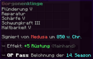 Eine tödliche Waffe, geschmiedet mit Plünderung V, Reparatur, Schärfe V, Schwungkraft III und Haltbarkeit V. Sie wurde von Medusa selbst verflucht und verleiht ihrem Träger immense Kraft.