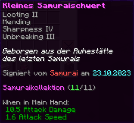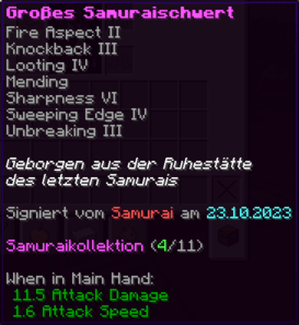 Aus der Ruhesätte des letzten großen Samurai, dieses Schwert besitzt die Macht des Feuers (Verbrennung), stößt Feinde weit zurück (Rückstoß) und garantiert extra Beute (Plünderung). Mit seiner Schärfe (Schärfe) und unbrechbaren Natur (Haltbarkeit) ist es eine Waffe der Legenden.