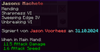 Eine tödliche Machete, getragen von Jason Voorhees, um Schrecken zu verbreiten. Verzaubert mit Schärfe VI, Schwungkraft IV, Reparatur und Haltbarkeit VI, wird sie zu einer ultimativen Angriffswaffe.