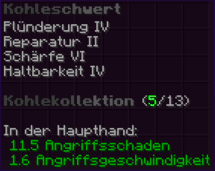 Ein legendäres Schwert, geschmiedet aus den tiefsten Flammen der Kohleberge und geschaffen für mächtige Krieger. Verzaubert mit Plünderung IV, Reparatur II, Schärfe VI und Haltbarkeit IV, bietet es nicht nur außergewöhnliche Durchschlagskraft, sondern auch die Fähigkeit, wertvolle Beute zu erlangen.