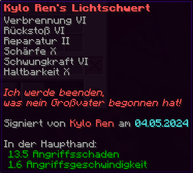 Kylo Rens Lichtschwert ist eine mächtige Waffe, die das Erbe seines Großvaters fortführt. Mit Verbrennung VI brennt es Feinde nieder, während Rückstoß VI sie zurückstößt. Reparatur II und Schärfe X machen es extrem scharf und langlebig. Schwungkraft VI und Haltbarkeit X runden dieses unglaubliche Schwert ab. "Ich werde beenden, was mein Großvater begonnen hat!"
