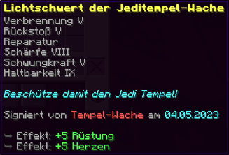 Dieses Lichtschwert ist speziell für die Wachen des Jedi-Tempels gefertigt. Mit Verbrennung V und Rückstoß V ist es perfekt für den Schutz des Tempels. Reparatur, Schärfe VIII und Schwungkraft V machen es zu einer hervorragenden Waffe. Haltbarkeit IX sorgt dafür, dass es lange hält. Beschütze den Jedi-Tempel mit dieser unglaublichen Waffe!