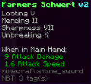 Das Farmers Schwert v2 ist ein wahres Meisterwerk der Kampfkraft und Effizienz, geschmiedet für den mutigen Beschützer der Felder. Mit scharfer Präzision (Schärfe VII) besiegt es Feinde mit Leichtigkeit, während es dank seiner magischen Stärke wertvolle Beute (Plünderung V) von seinen Gegnern sammelt. Das Schwert heilt sich selbst (Mending II) und ist durch seine immense Haltbarkeit (Haltbarkeit X) nahezu unzerstörbar.