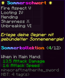 Das Sommerschwert ist ein legendäres Artefakt, durchdrungen von der reinen Kraft der Sonne. Mit seinem feurigen Schlag (Feueraspekt V) entfacht es lodernde Flammen, die deine Gegner in Angst und Schrecken versetzen. Durch seine unermessliche Schärfe (Schärfe X) gleitet es mühelos durch jede Rüstung und besiegt selbst die stärksten Feinde. Doch das ist nicht alles – dank seiner magischen Fähigkeit (Reparatur) heilt sich das Schwert selbst und bleibt immer kampfbereit. Seine unglaubliche Unzerbrechlichkeit (Haltbarkeit VI) sorgt dafür, dass es auch nach unzähligen Abenteuern nicht zerbricht.