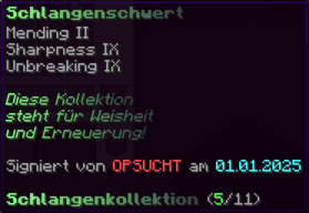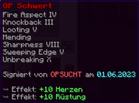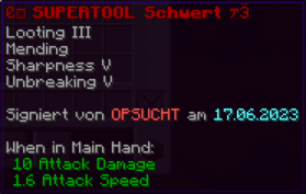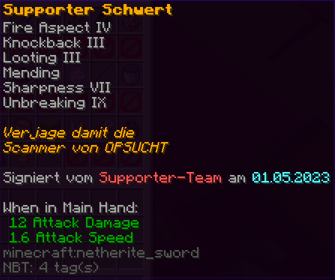 Das Supporter Schwert ist ein mächtiges Werkzeug, das speziell geschmiedet wurde, um die dunklen Machenschaften der Scammer in der Welt von OPSUCHT zu beenden. Mit seiner beeindruckenden Schärfe (Schärfe VII) und seinen feurigen Angriffen (Feueraspekt IV) vertreibst du jeden Übeltäter im Handumdrehen. Durch die Magie der Reparatur bleibt es immer kampfbereit, und dank seiner unzerstörbaren Kraft (Haltbarkeit IX) trotzt es den härtesten Herausforderungen.