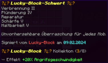 Ein Schwert mit verborgenen Kräften, verleiht "Verbrennung II", "Plünderung IV", "Reparatur" und "Schärfe V". Mit jedem Treffer auf ein Wesen könnte eine unerwartete Wendung folgen. Als Zuwachs der Geschwindigkeit um 20% macht dieses Schwert aus der Lucky-Block-Kollektion seinen Träger schneller und gefährlicher.