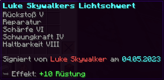 Luke Skywalkers Lichtschwert ist ein Symbol der Hoffnung und des Mutes. Mit Rückstoß V und Reparatur bleibt es immer kampfbereit. Schärfe VI und Schwungkraft IV machen es zu einer tödlichen Waffe, während Haltbarkeit VIII für Langlebigkeit sorgt. Dieses Lichtschwert ist ein wahrer Schatz.