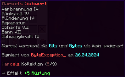 Marcels Schwert ist eine mächtige Waffe. Mit Verbrennung IV und Rückstoß IV verbrennt und stößt es Feinde zurück. Plünderung IV sorgt für wertvolle Beute, während Reparatur, Schärfe VII, Bann VII und Schwungkraft IV es extrem stark und langlebig machen. Marcel versteht die Bits und Bytes wie kein anderer!