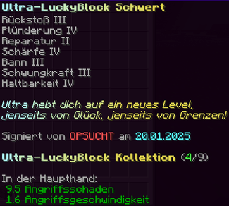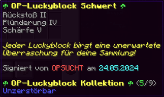 Das OP-Luckyblock Schwert ist eine mächtige Waffe. Mit Rückstoß II stößt es Feinde zurück, Plünderung IV sorgt für wertvolle Beute, und Schärfe V macht es extrem scharf. Jeder Luckyblock birgt eine unerwartete Überraschung für deine Sammlung! Signiert von OPSUCHT, ist dieses Schwert unzerstörbar und bereit für jedes Abenteuer.